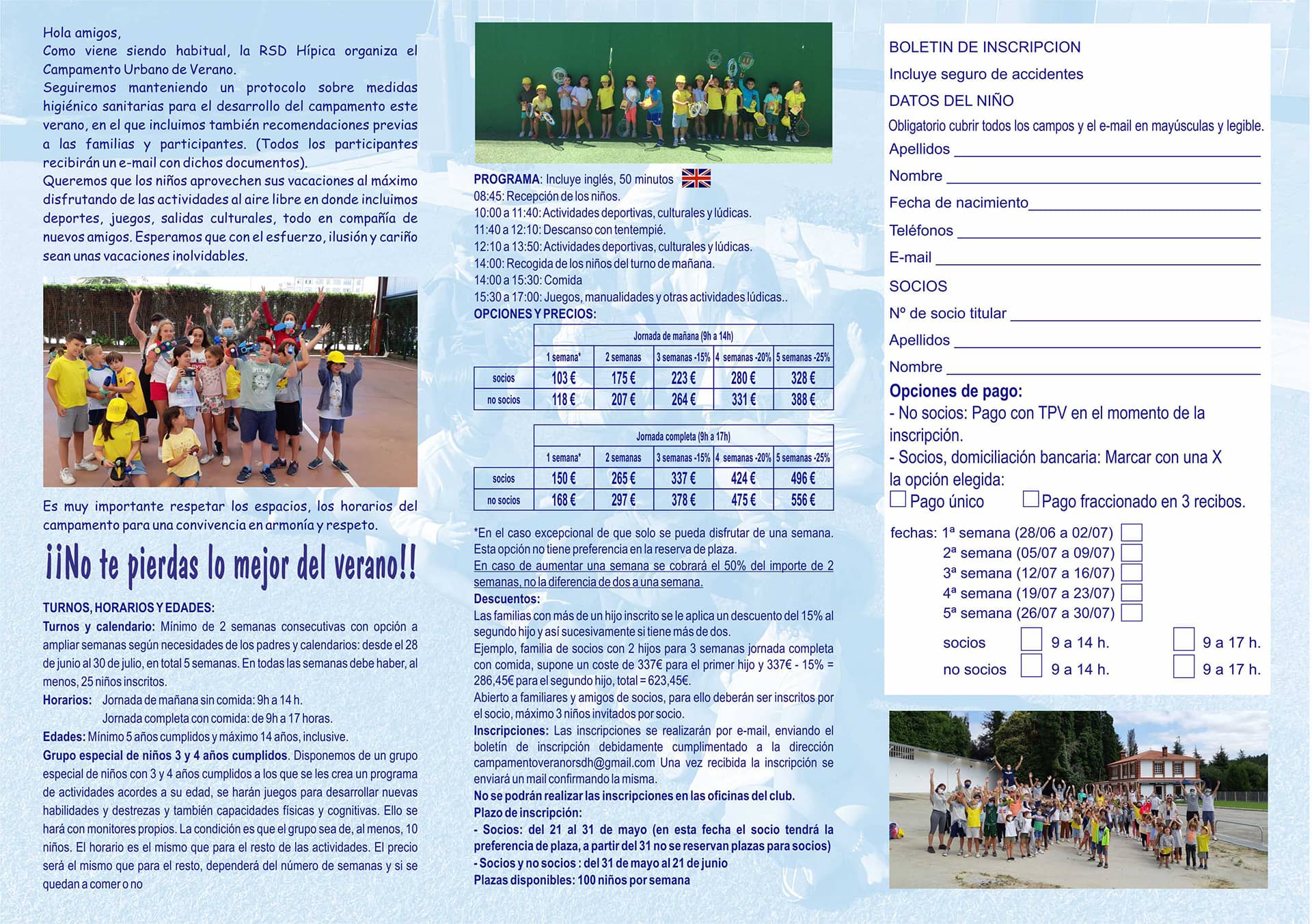 Como ya es habitual, en la R.S.D Hípica de La Coruña organizamos el campamento urbano de verano. Queremos que los niños aprovechen sus vacaciones al máximo, siguiendo todos los protocolos necesarios. Podéis ver el programa, fechas, opciones y tarifas en el tríptico que os mostramos a continuación.